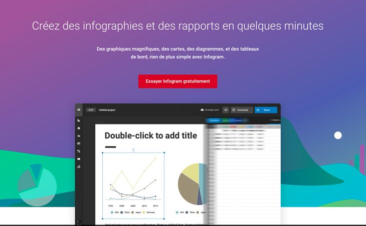 L’éditeur présent sur Infogram permet de convertir les données entrées dans l’application, en infographie originales prêtes à être partagées à vos collègues, publiées sur les réseaux sociaux ou intégrées à votre site web.