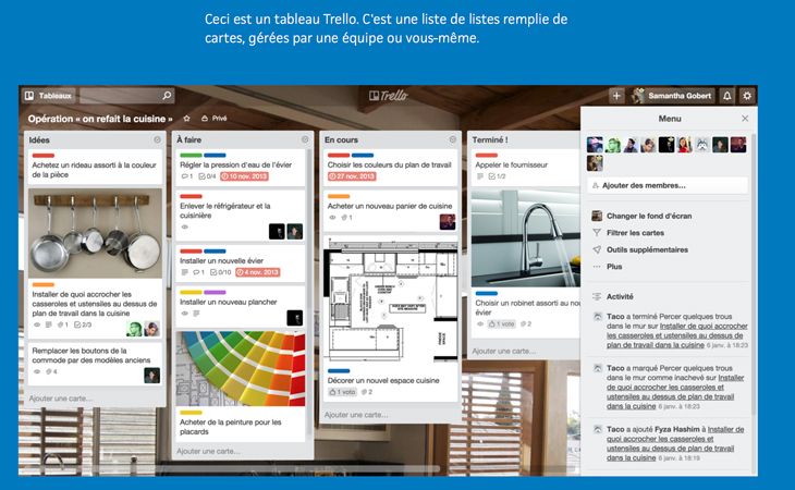 Trello se présente comme un tableau de bord et vous permet, à travers des étiquettes et des cartes, de lister et prioriser votre travail comme bon vous semble. Très intuitif, vous pouvez par exemple, déplacer chaque tâche d’un tableau à un autre, pour mieux l’organiser.