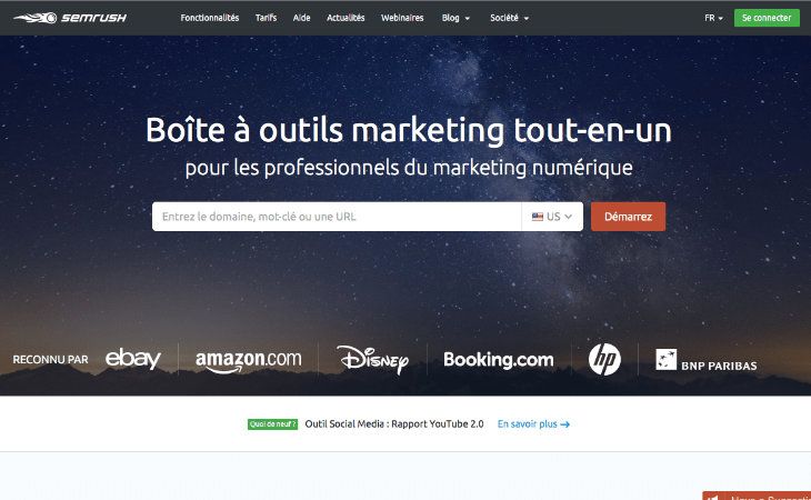 Outil de marketing en ligne ultra complet SEMRUSH vous offre de nombreuses fonctionnalités importantes et efficaces pour renforcer votre visibilité sur le web, réseaux sociaux inclus :