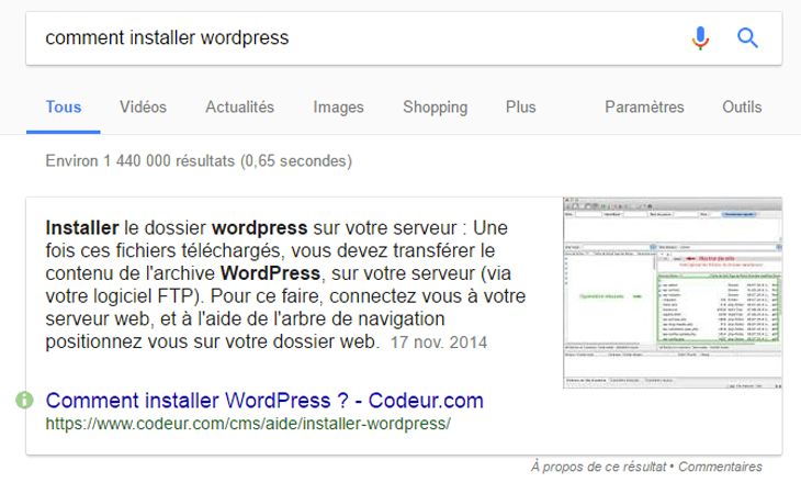 Dans cet exemple et pour la requête « comment installer wordpress », c’est le site populaire codeur.com qui est relié à la Google answer box. L’aspect positif pour l’internaute est qu’il est au courant d’une partie du contenu de l’article sans avoir à cliquer sur un lien.