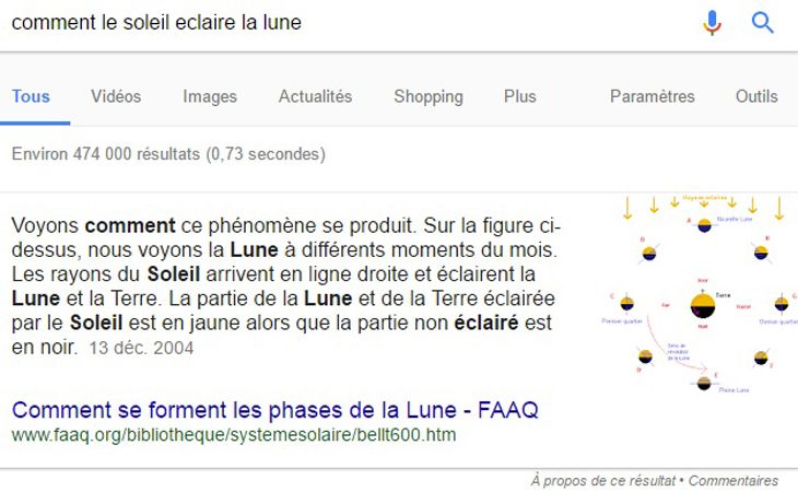 Ici, sur la requête « comment le soleil éclaire la lune », le site en position 0 est faaq.org et la définition de wikipedia est en position 1 des résultats.